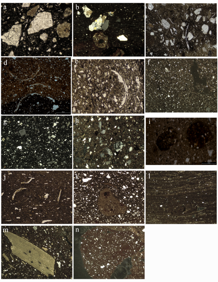 a-c 矿物及岩屑类羼合料;d-e 植物类夹杂物;f-h 粉砂类夹杂物;i-j高比例黏土基质;k.钙质结核; l黏土不均匀混合; m贝壳类羼合料; n熟料类羼合料.